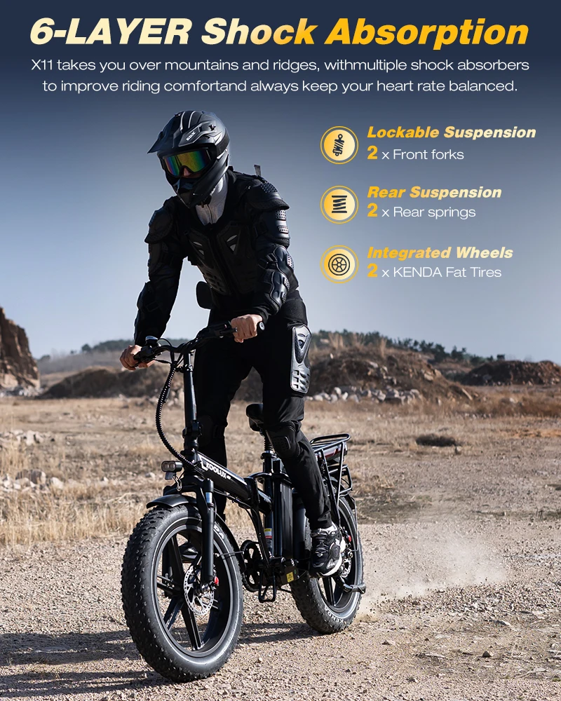 The KOOLUX X11 is a powerful electric bike with wide tires and a dual-battery system, which provides exceptional range and high stability on various surfaces. Equipped with 500W motor and two 48V 13 + 10.4Ah batteries, results in a total capacity of 23.4Ah, providing an impressive range of up to 150 km can be achieved.