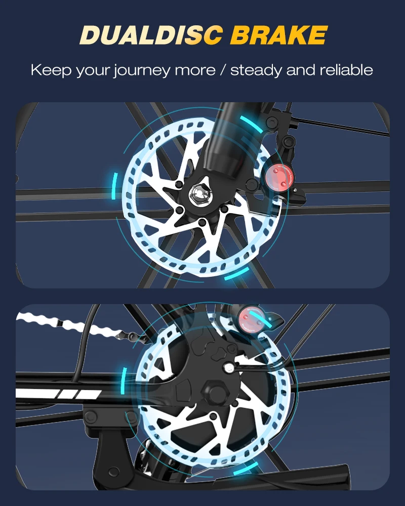 The KOOLUX X11 is equipped with dual hydraulic disc brakes that provide exceptional braking performance and maximum control. Thanks to the precise responsiveness and powerful deceleration, you can stop safely in any situation, whether on wet roads or at high speed. This advanced braking technology ensures a reliable and safe riding experience.