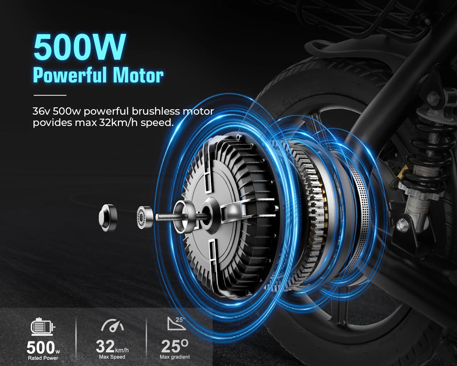 Powerful Performance: The 500W motor ensures smooth acceleration and the ability to tackle steep inclines.