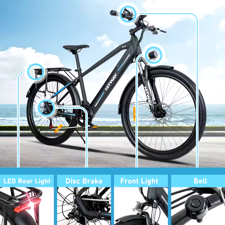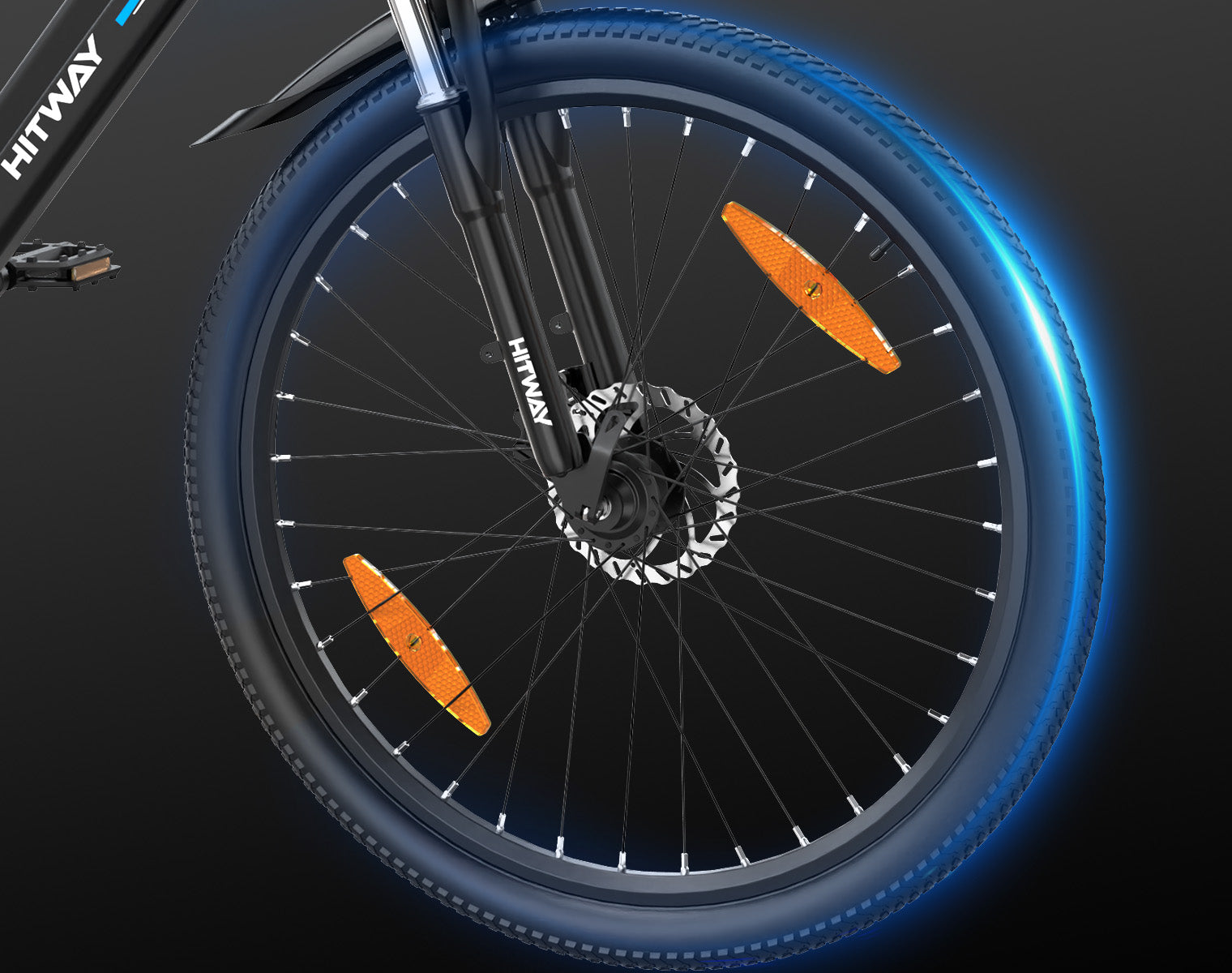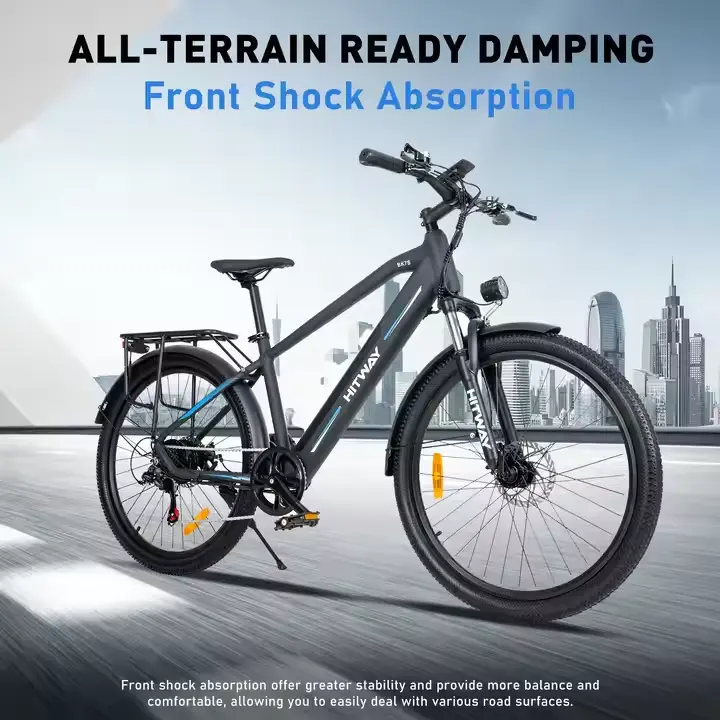The HITWAY e-bike boasts a front and rear disc brake configuration coupled with a Shimano 21-speed transmission system. The front suspension fork absorbs uneven terrain, delivering smooth cushioning and shock absorption on rugged mountain trails for an exhilarating riding experience. The suspension absorbs shocks and vibrations, providing a smoother ride on uneven surfaces. Whether on city streets or rough paths, you’ll experience greater comfort and control. Additionally, the 26" x 2.35" tires provide excellent shock absorption capabilities.