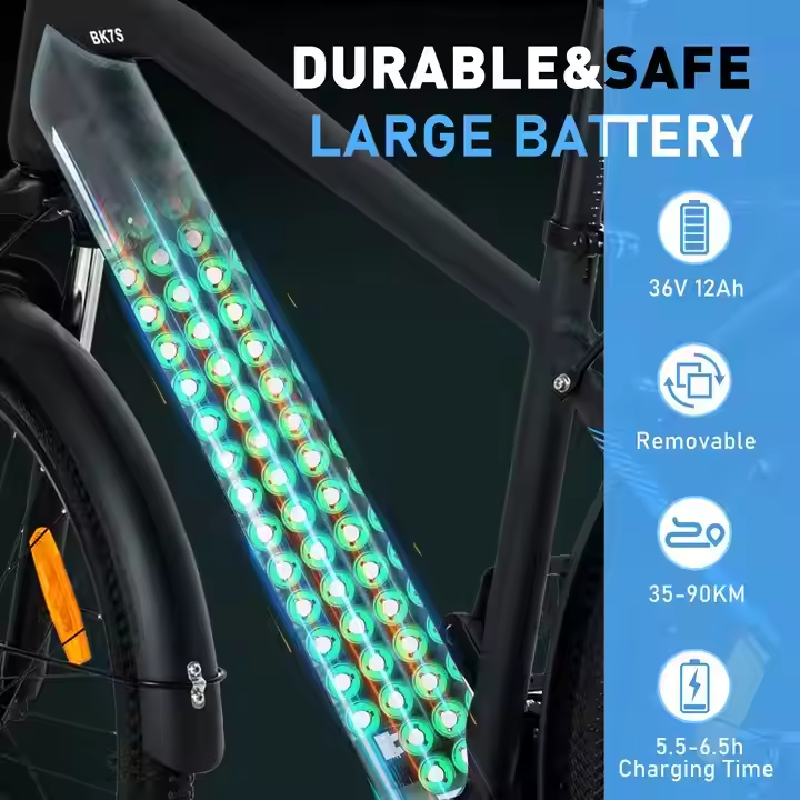 The 36V 12Ah removable battery is seamlessly embedded within the bike frame, providing a modern, streamlined appearance. This design enhances both aesthetics and functionality, giving you longer rides without compromising the bike's stylish profile.