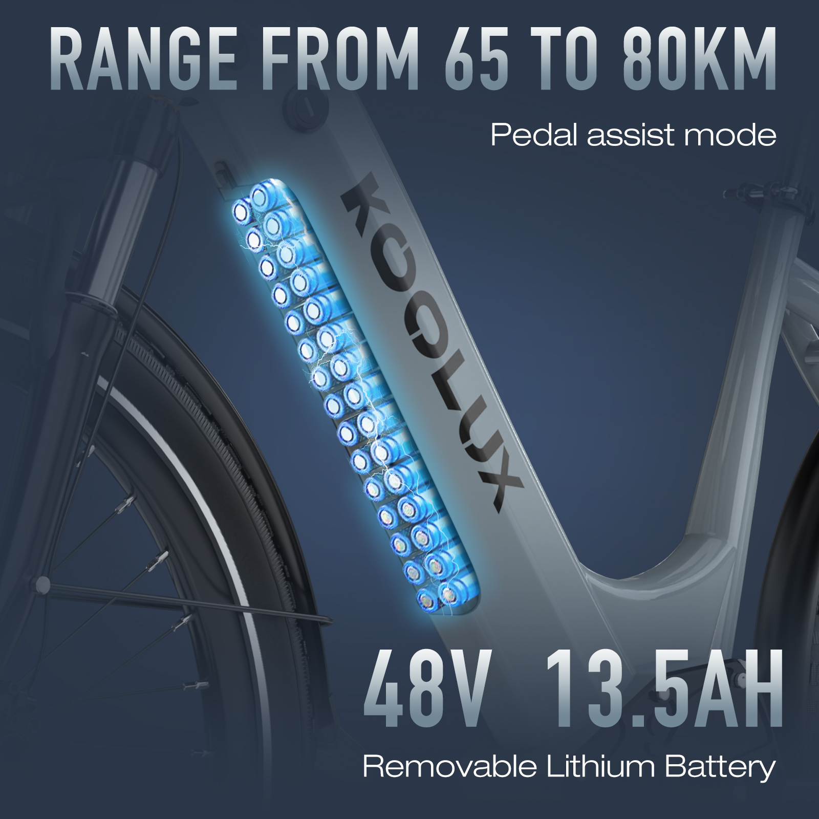 The KOOLUX X2 e-bike is equipped with a removable 48V 13.5Ah battery that can be easily charged anytime, anywhere. The battery is seamlessly integrated into the frame, giving the bike a stylish look while offering an excellent range of 45-85 kilometers per charge, depending on riding conditions.