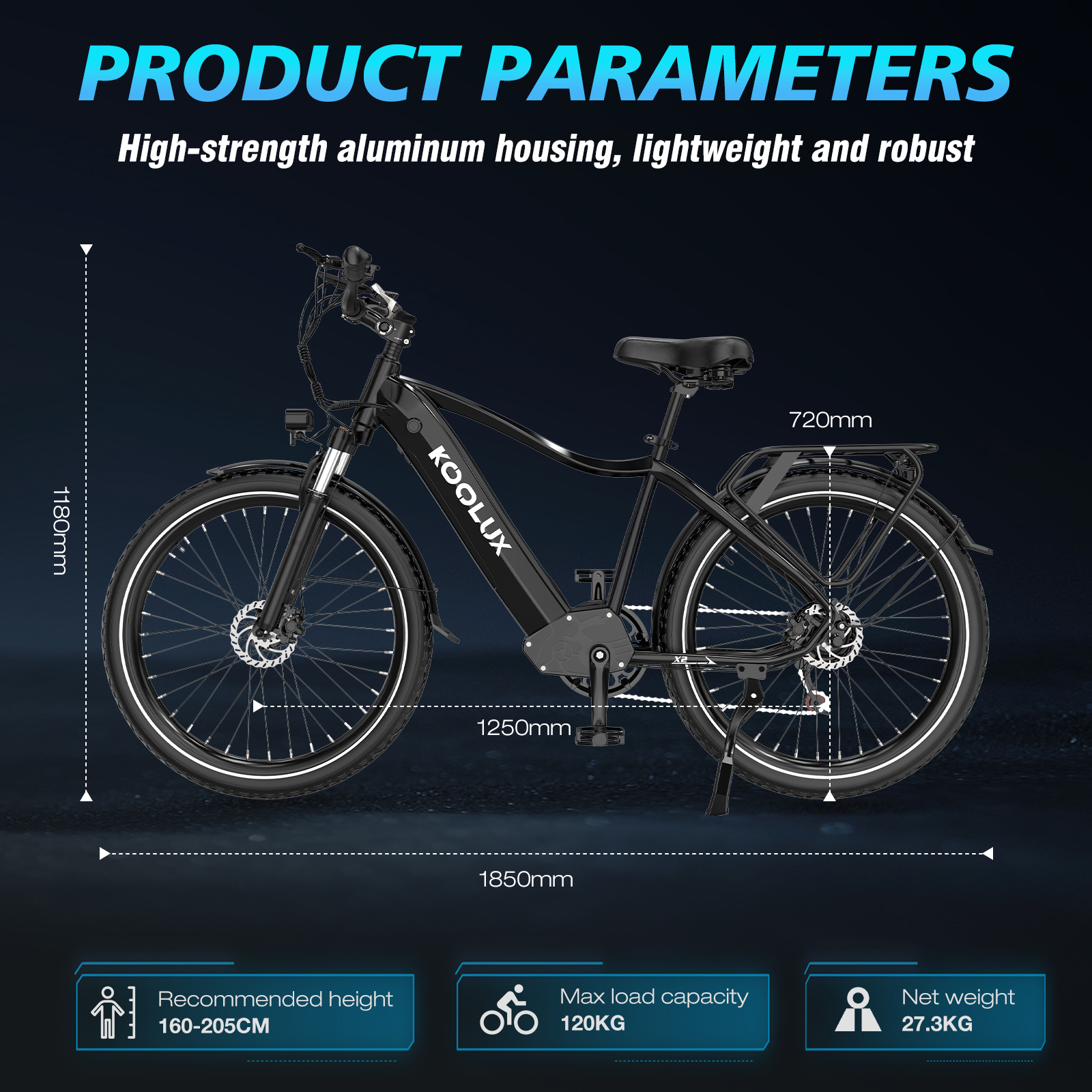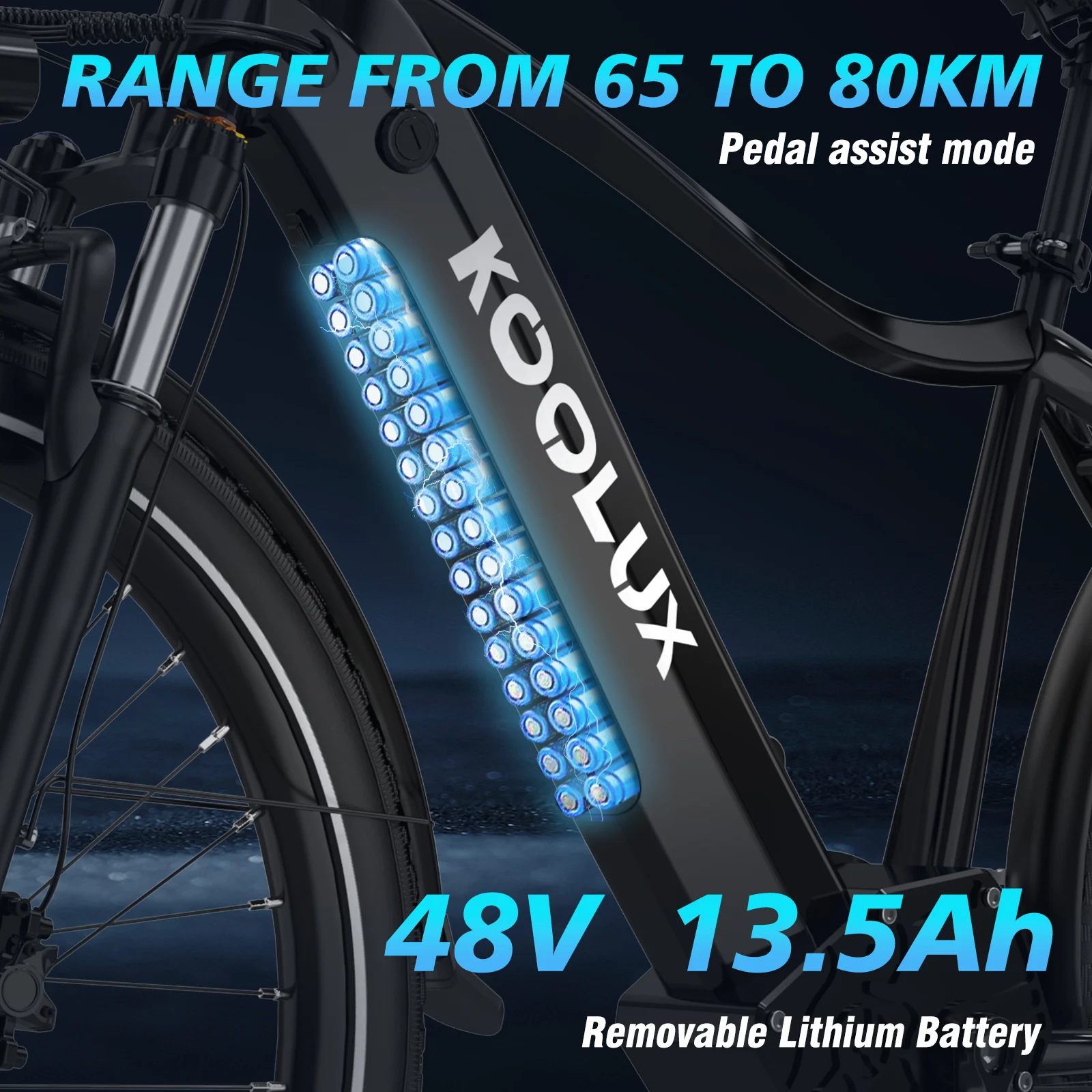 The KOOLUX X3 e-bike is equipped with a removable 48V 15Ah battery that can be easily charged anytime, anywhere. The battery is seamlessly integrated into the frame, giving the bike a stylish look while offering an excellent range of 45-85 kilometers per charge, depending on riding conditions.