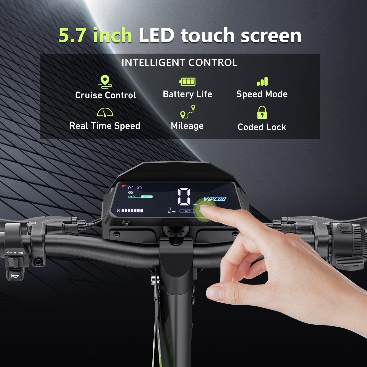 Introducing the VIPCOO VS6 Pro Touch Screen Electric Scooter—where cutting-edge design meets rugged performance for adventurous riders. Powered by a robust 240W motor and a high-capacity 52V 20.8Ah battery, the VS3 delivers thrilling speeds up to 50 km/h  and a substantial range of up to 65 km on a single charge. Its standout feature—a sleek touch screen display—offers intuitive control over speed, battery status, and ride modes, providing an engaging and high-tech riding experience wherever the road takes you.