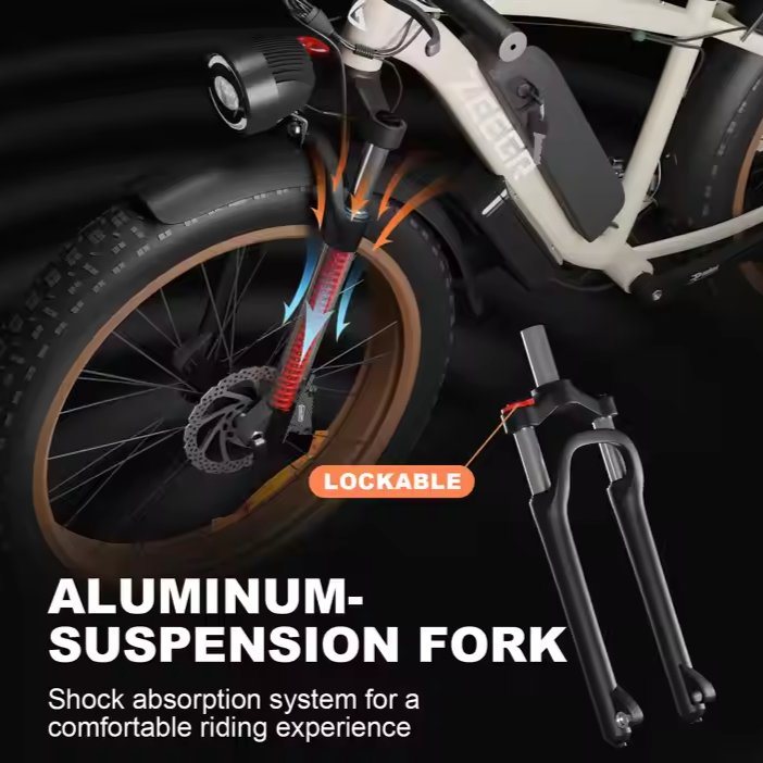 The electric bike features front lockable suspension forks that effectively absorb bumps enhancing rider control over the front wheel, particularly on rough terrain. This feature ensures a safer and smoother cycling experience, making the well-performing e-bike ideal for diverse riding.